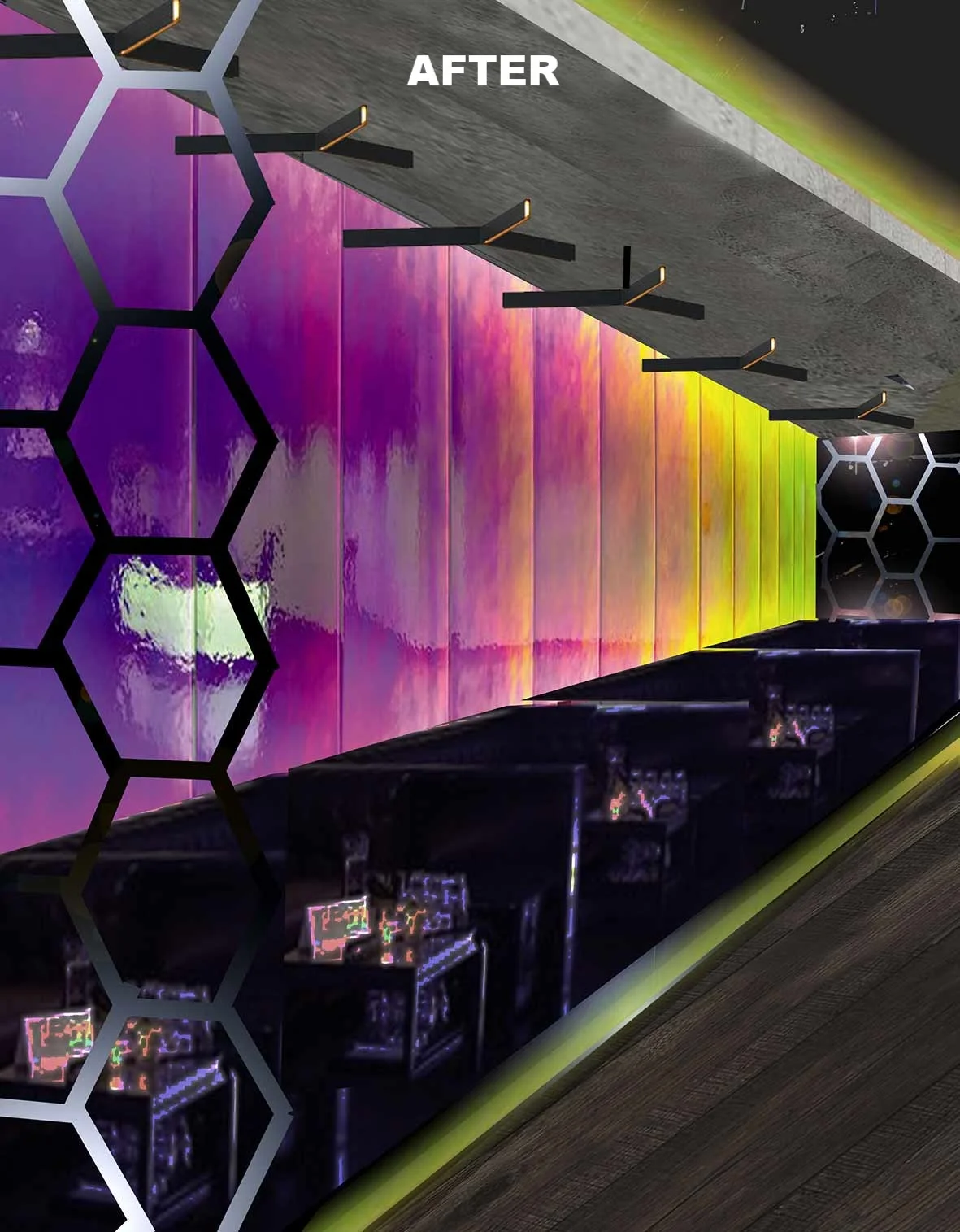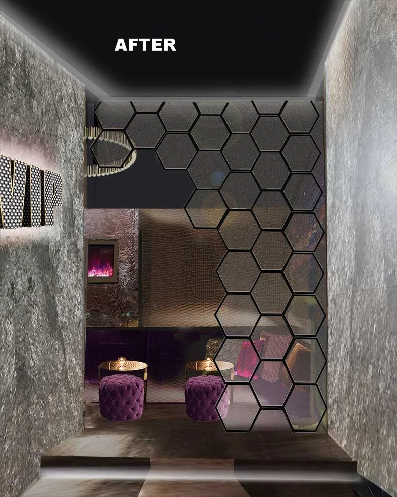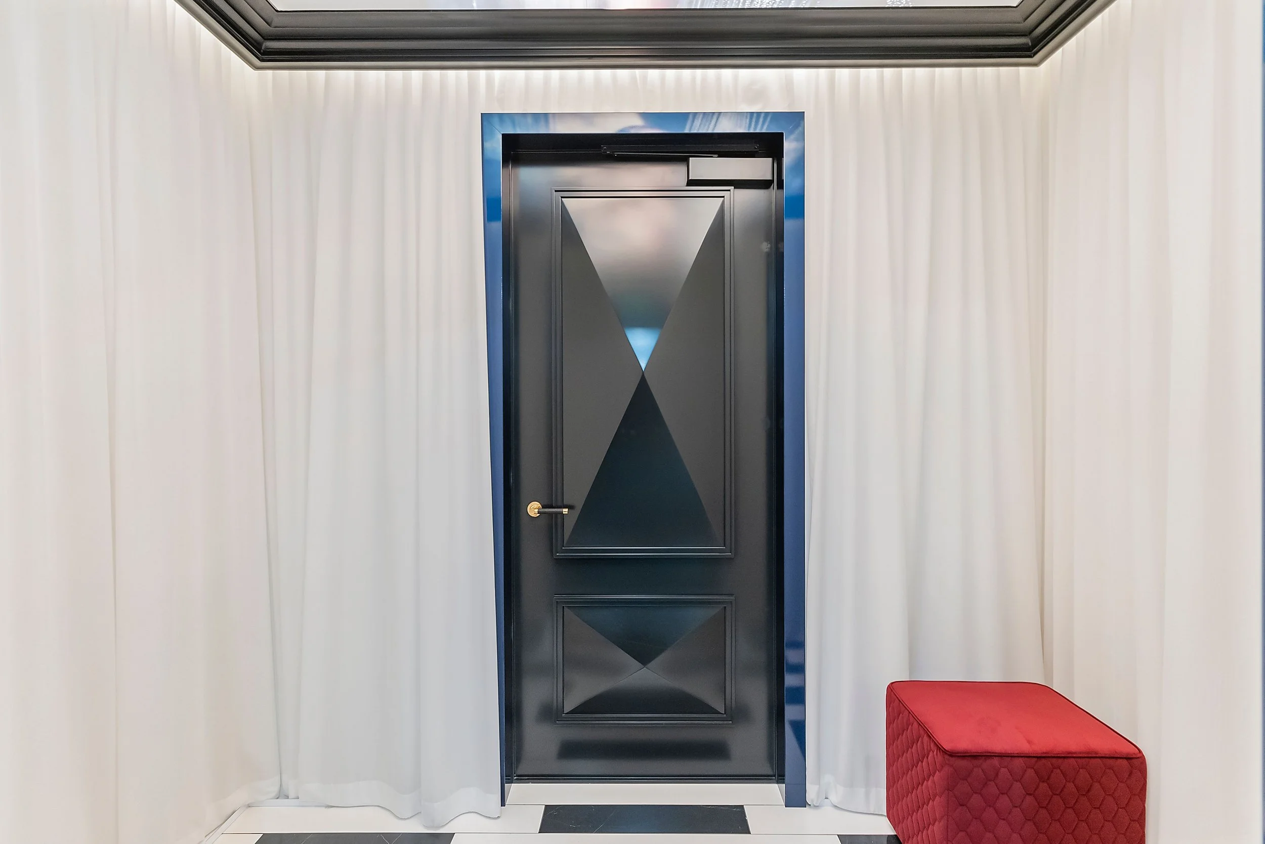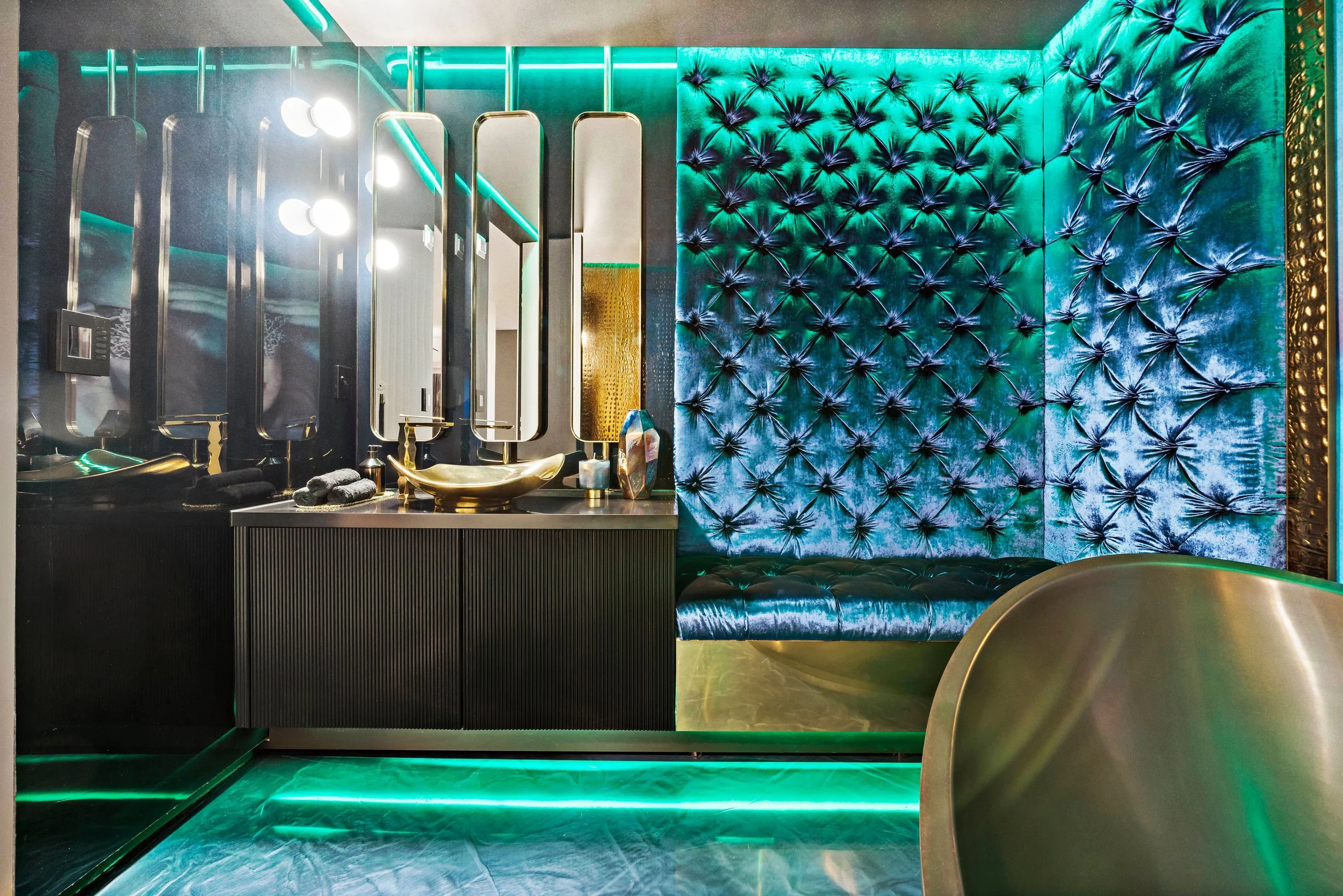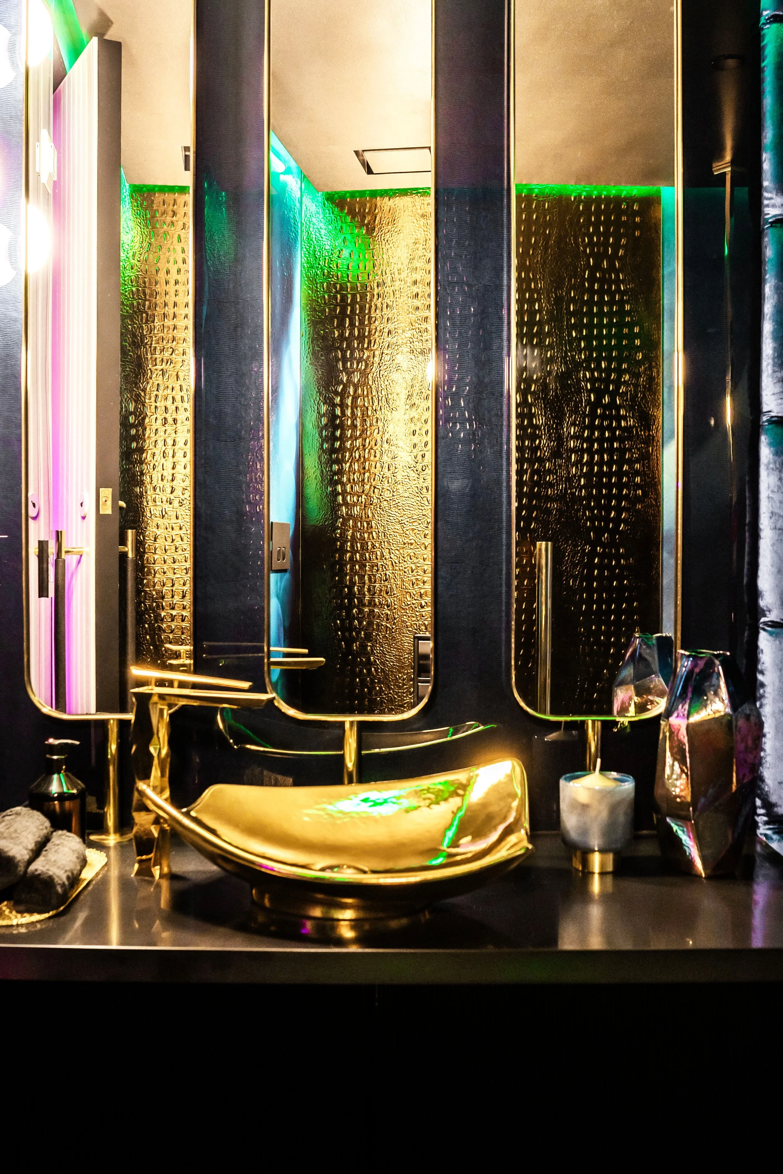 The brief was to create an ultra-luxurious, sophisticated yet funky powder room. Every aspect of this room was custom designed and unique, from the dropped circular ceiling to the full height deep blue tufted luxurious booth seat and custom designed brass mirrors and vanity. The feature wall panels were imported from Austria, the vessel and plumbing fixtures are 22 karat gold and the striking graphic adorning the curved wall was sourced from a European fashion photographer. A room filled with surprises and delight!